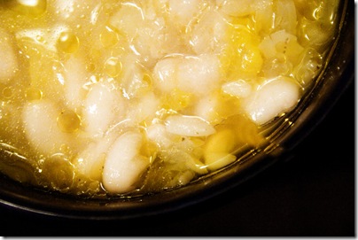 2. Slice the cabbage (1/4")and dice the onion (1/4-1/2"). Add the onion with the bay leaf, water and stock to the beans. Cover, bring to a rapid simmer and cook until the beans are tender (2-3 hours, depending on how old the beans are). Add the cabbage and season with salt and pepper to taste. Simmer for another 15 minutes.