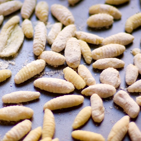 A note on how to form gnocchi: using a gnocchi board (picture), or the tines of a fork, lightly press the gnocchi to form ridges. Method (a), in the photo above, I used my index finger to create ridges on one half and smoosh the other side into a orochietti shape. Method (b), use the palm of your hand to quickly roll a segment of dough down the board. The dough turns into a tube (gemelli shape) , and this is how I made all of the gnocchi pictured at the top. Alternately, refrigerate large tubes (1" diam) and slice with a knife into scallop sized pieces.